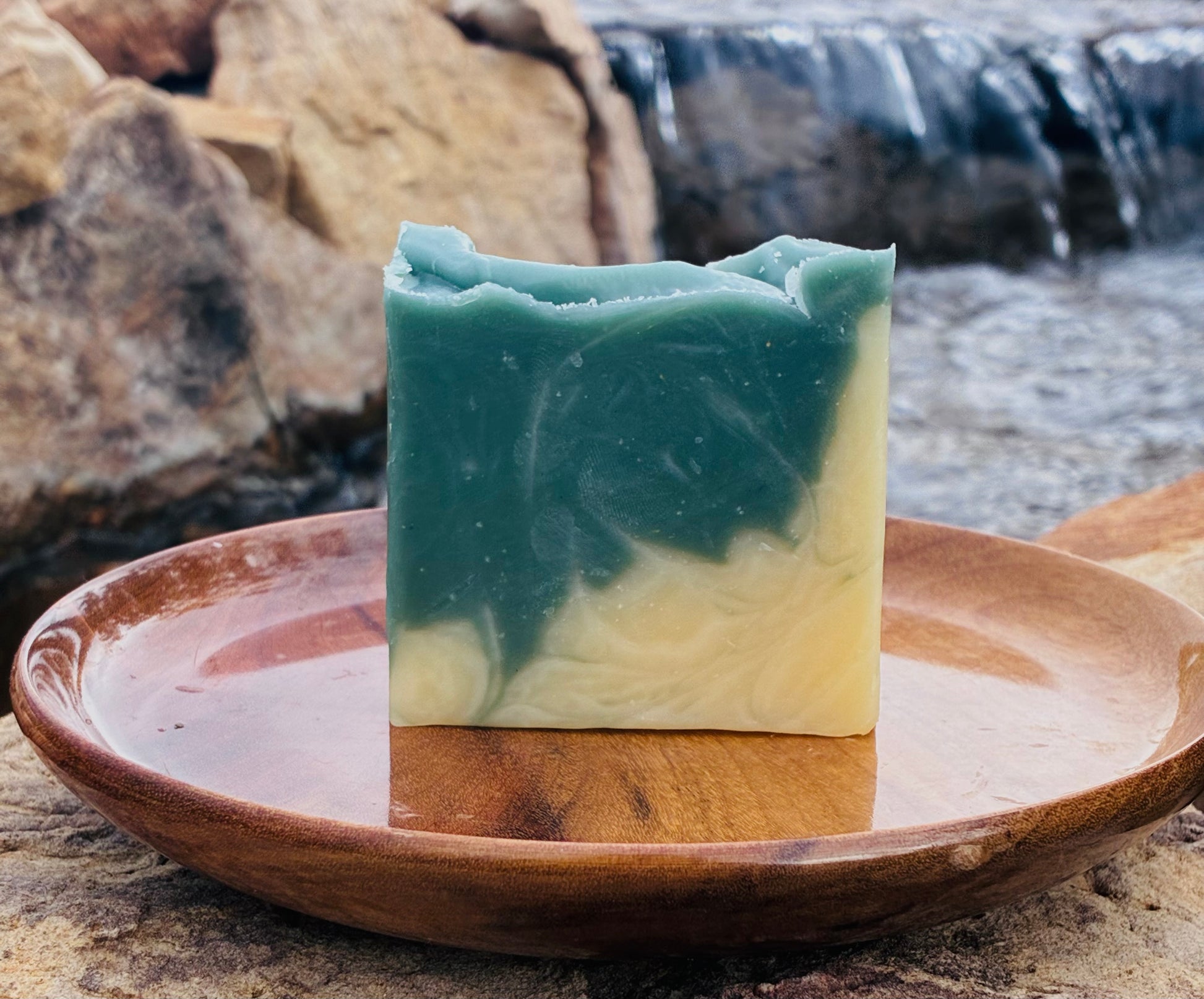 Water, Coconut Oil, Ricinus Oil, Mango Butter, Olive Oil, Sodium Hydroxide, Karite (Shea) Butter, Kokum Butter, Essential Oils (Pine, Ginger, Cassia, Cedarwood, Sandalwood, and Clove), Kaolin Clay