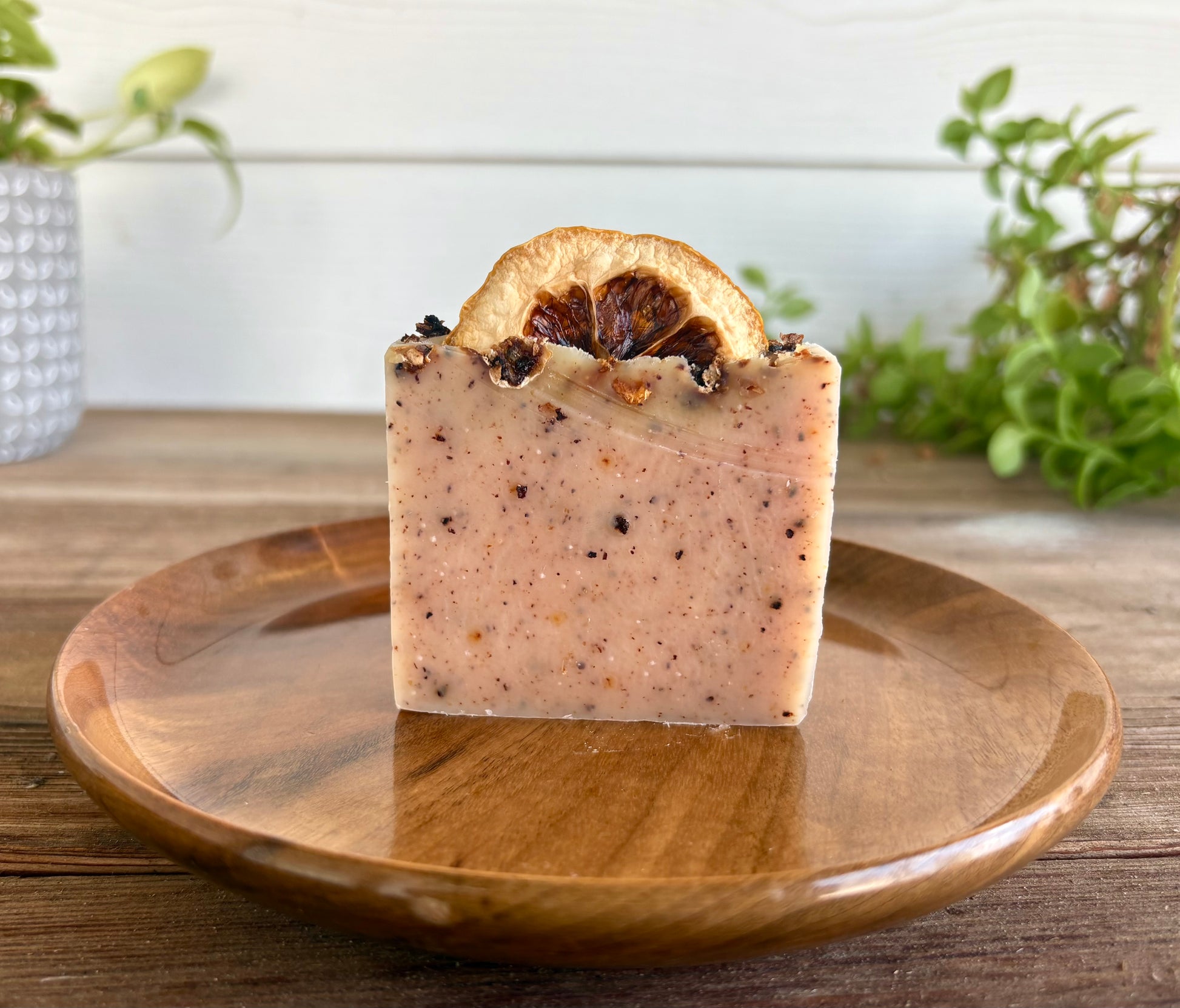 Water, Coconut Oil, Kokum Butter, Mango Butter, Sodium Hydroxide (Lye), Ricinus Oil, Avocado Butter, Palm Oil, Olive Oil, Essential Oils (Lemon and Litsea Cubeba), Ground Almond, Ground Lychee Shell