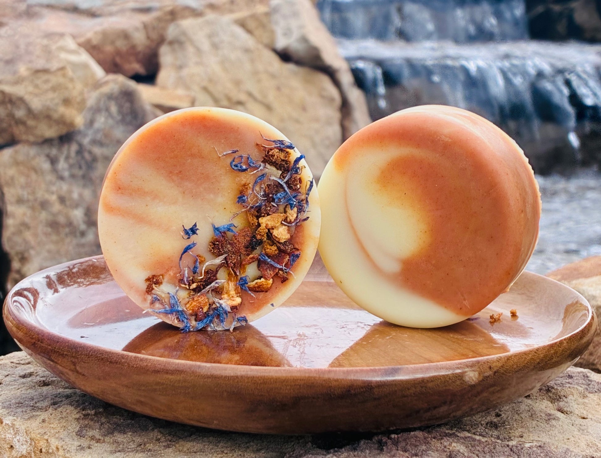 Water, Karite (Shea) Butter, Mango Butter, Coconut Oil, Ricinus Oil, Sodium Hydroxide, Olive Oil, Essential Oils (Sweet Orange, Ginger, Litsea Cubeba, and Frankincense), Kaolin Clay, Cornflower Petals, Dried Orange Rind